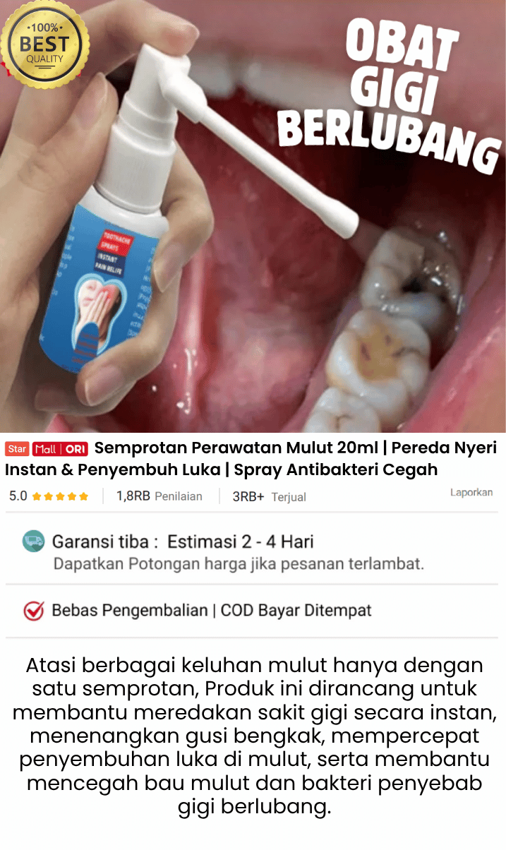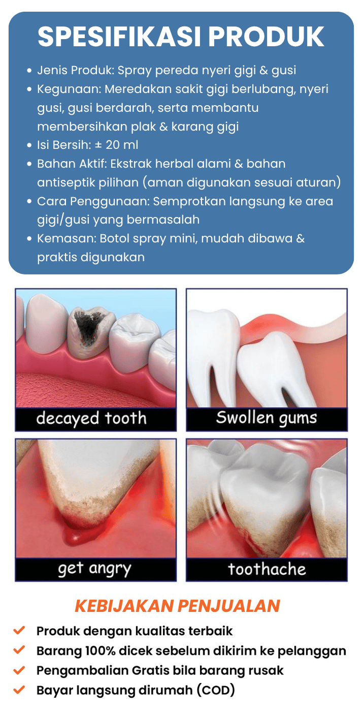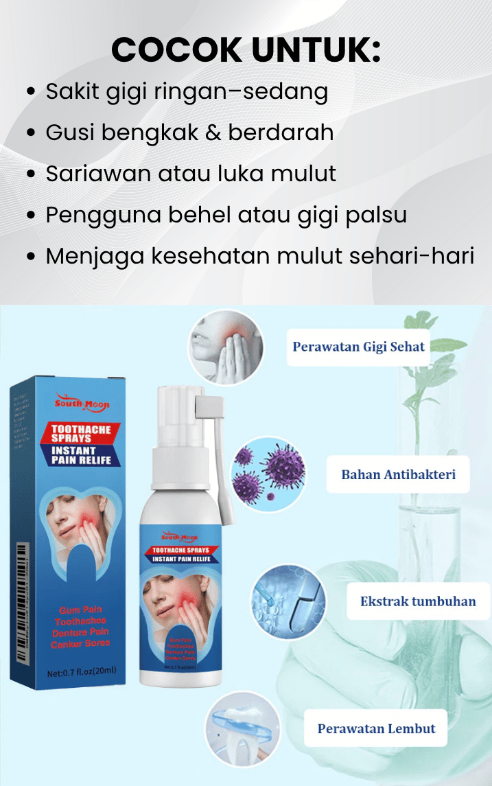 Atasi berbagai keluhan mulut hanya dengan satu semprotan, produk ini dirancang untuk membantu meredakan sakit gigi secara instan, menenangkan gusi bengkak, mempercepat penyembuhan luka di mulut, serta membantu mencegah bau mulut dan bakteri penyebab gigi berlubang.